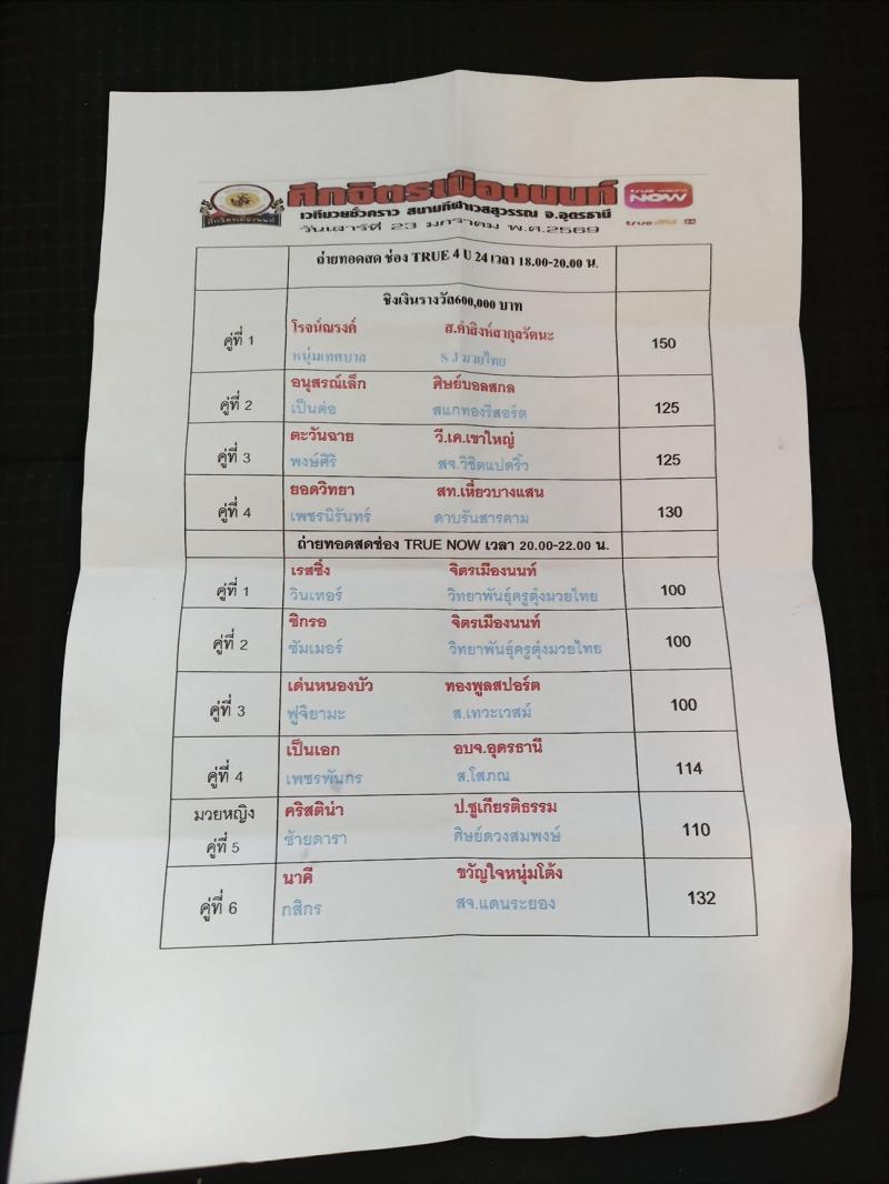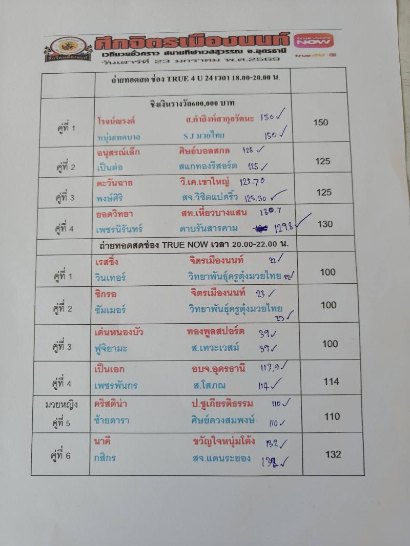 ศึกจิตรเมืองนนท์ สัญจร ประจำวันศุกร์ที่ 23 มกราคม 2569 ณ เวทีชั่วคราว สนามกีฬาเวสสุวรรณ อำเภอเมือง จ.อุดรธานี ชมกัน 2 ช่วง ช่วงแรกทางช่อง True4U กด 24 เริ่ม 18.00-20.00 น. เป็นต้นไป สามารถสมัครได้ที่แอป True Vision Now ช่วงที่ 2 ชมทางช่อง True Vision Now เริ่ม 20.00 - 22.00 น.