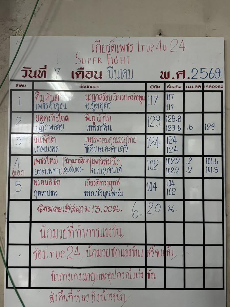 | 03/01/2569 14:30 | ศึกมวยไทยเกียรติเพชร | เพชรแสงดาว ส.โชคมีชัย |